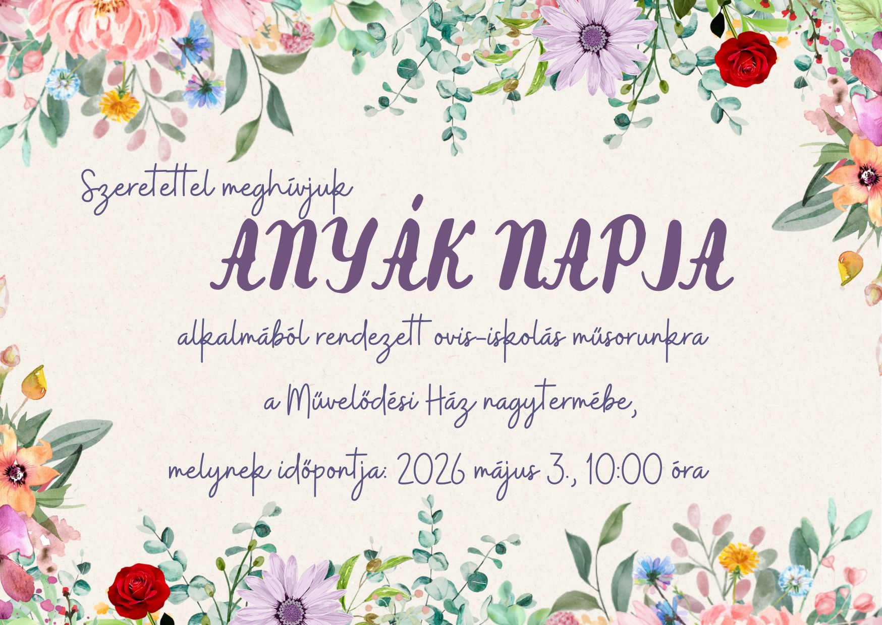 Szeretettel meghívjuk Anyák Napja alkalmából rendezett ovis-iskolás műsorunkra.