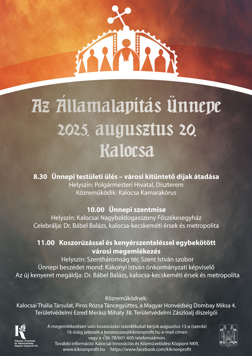 Kalocsa Város Önkormányzata és a szervező KIKK Kft. tisztelettel hívja Önöket Szent István államalapító királyunk és az új kenyér megáldásának ünnepére!