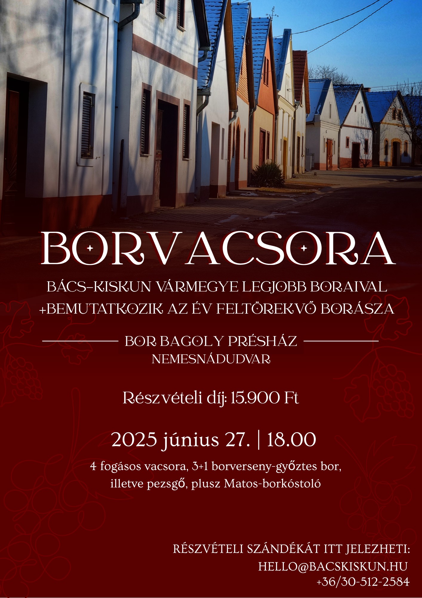 Az eseményen Bács-Kiskun vármegye borait, valamint pezsgőjét kóstolhatják a kedves jelenlévők, emellett a finom fogásokat a Katarina Birtok és Étterem biztosítja.