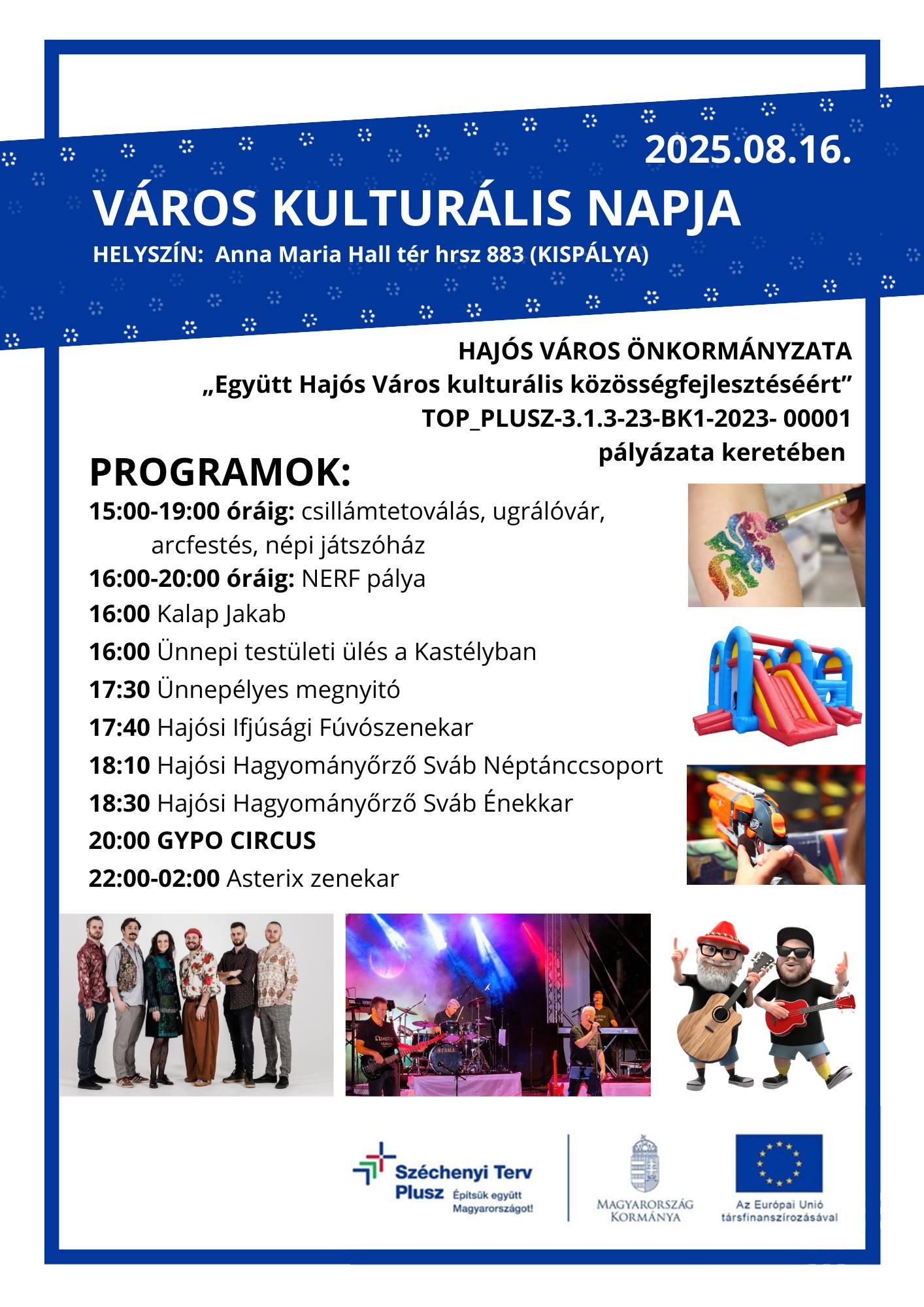 Délelőtt: bográcsozási lehetőség a város civil szervezetei és baráti társaságok számára. Az elkészült ételek kóstolójeggyel kóstolhatók. Kóstolójegyre regisztrálni a Hajós Városért Alapítvány adománygyűjtő pultjánál lehet.