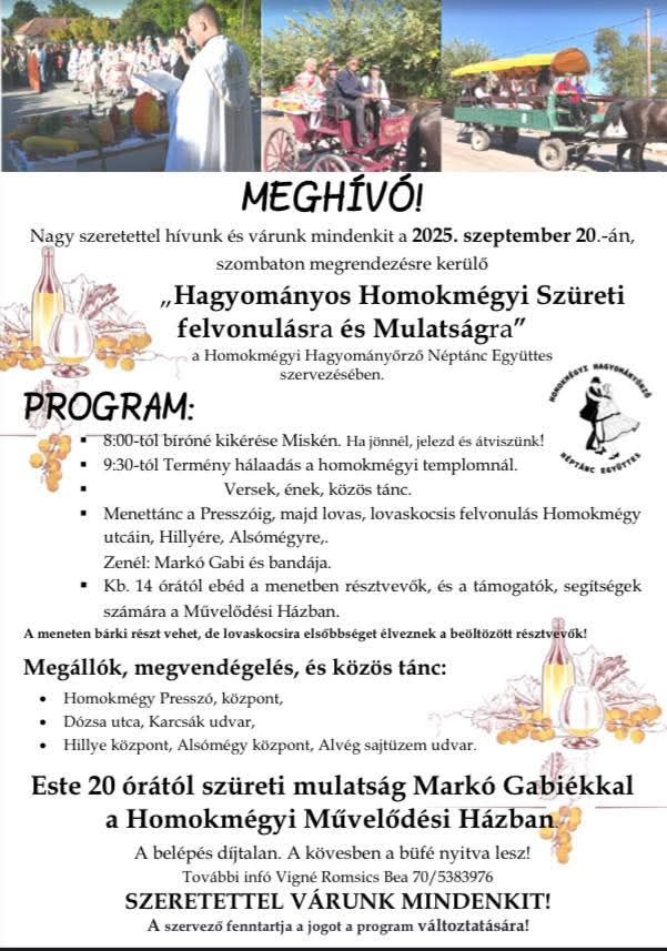 A főszervező Homokmégyi Hagyományőrző Néptánc együttes szeretettel hív, és vár mindenkit az idei szüreti felvonulásra!