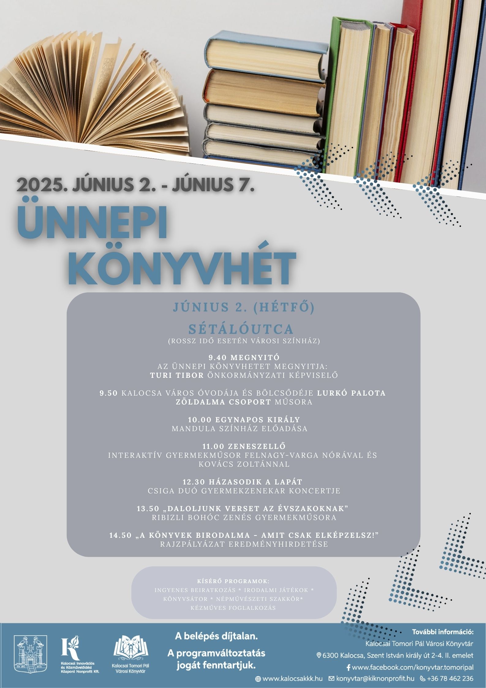 Könyvtári rendezvény, első nap kihelyezett könyvtár a Sétálóutcában, majd egész héten könyvbemutatók, irodalmi előadások minden korosztály számára.