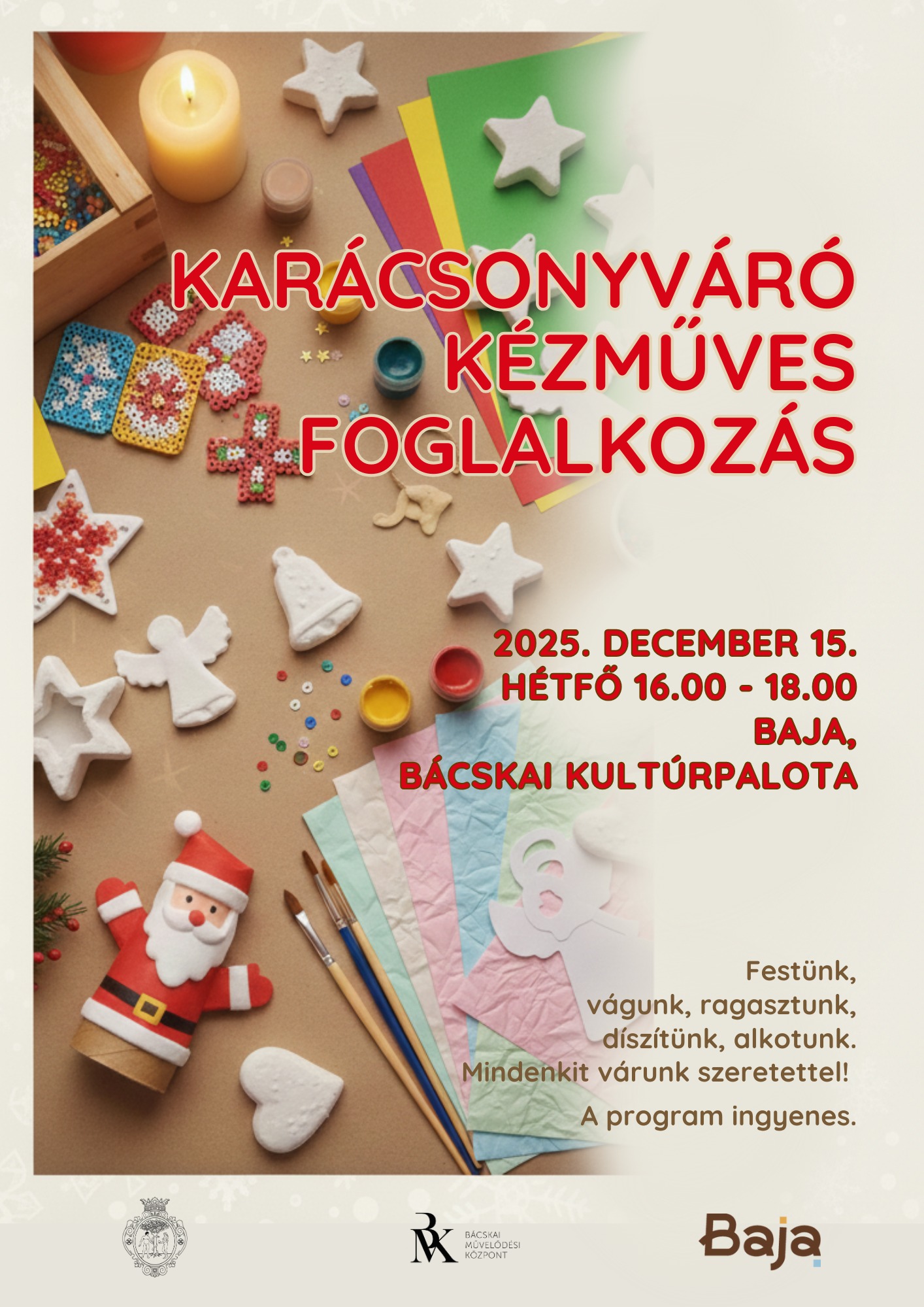 Várunk minden ügyes kezű és kíváncsi gyermeket egy vidám, karácsonyváró kézműves foglalkozásra.