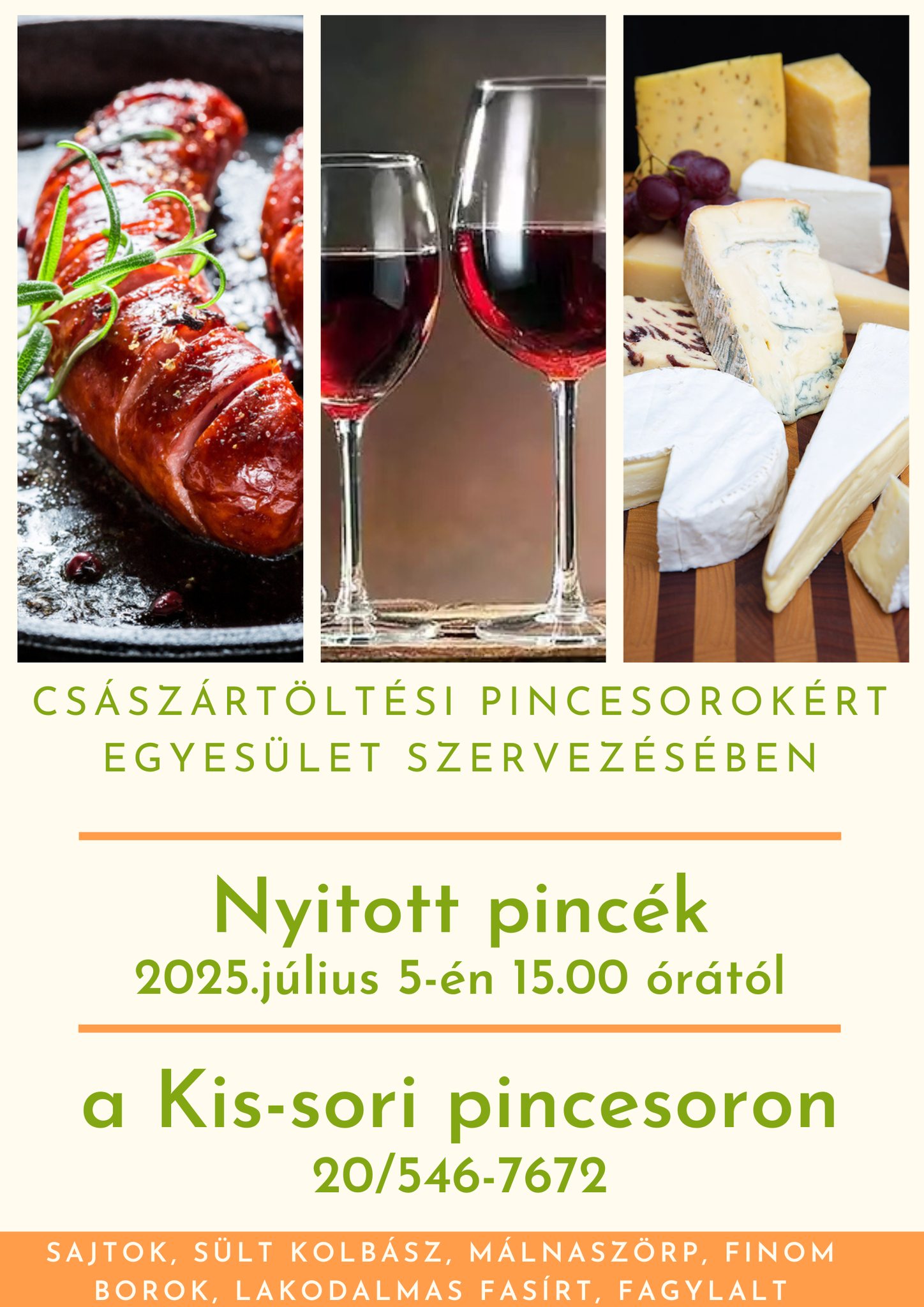 Sajtok, sült kolbász, málnaszörp, finom borok, lakodalmas fasírt, fagylalt - a Császártöltési Pincesorokért Egyesület szervezésében.