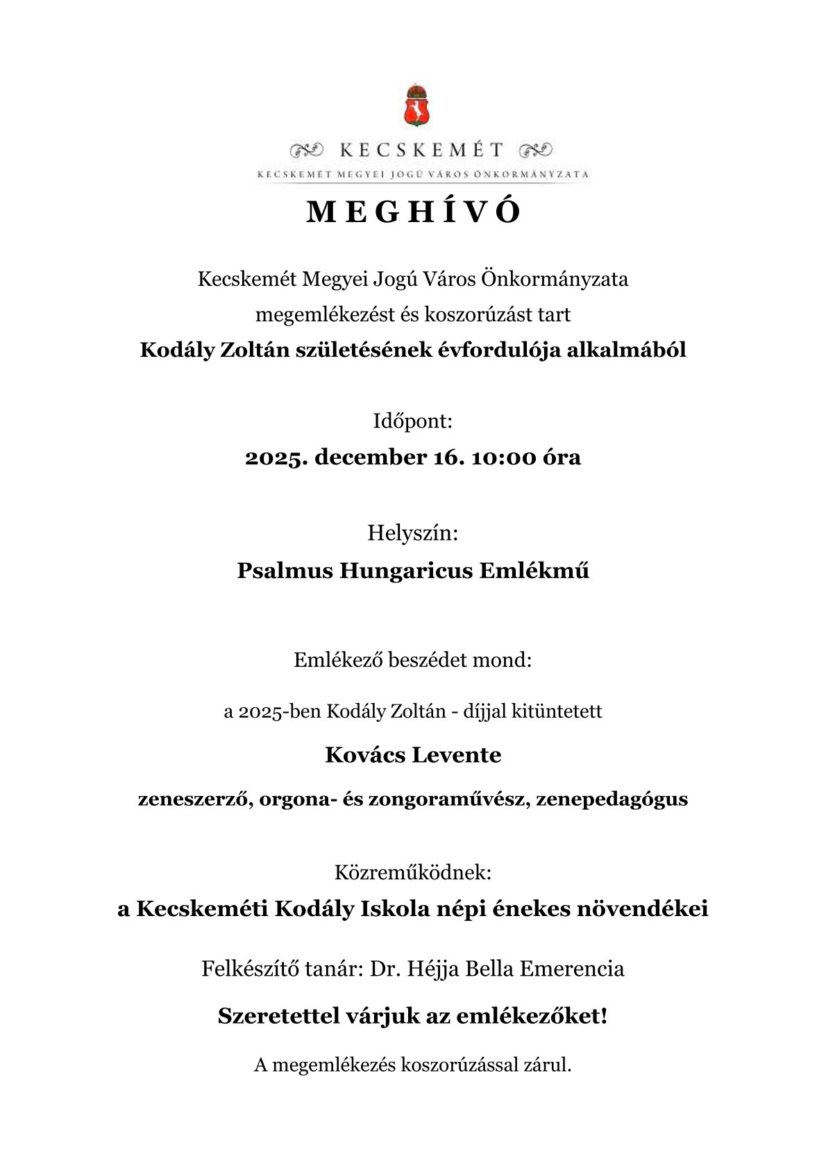 Emlékező beszédet mond: a 2025-ben Kodály Zoltán - díjjal kitüntetett Kovács Levente zeneszerző, orgona- és zongoraművész, zenepedagógus.
