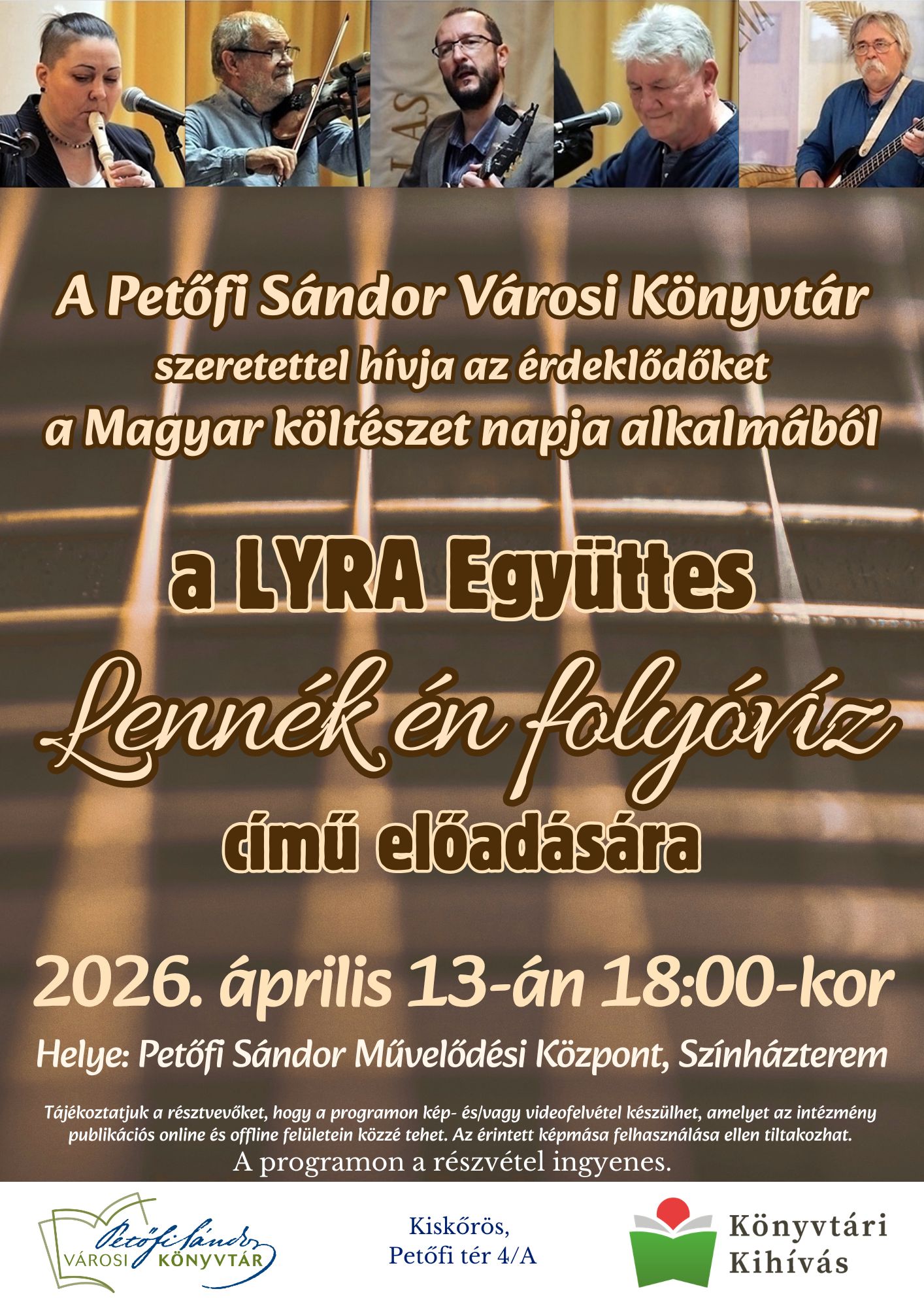 A költészet napja alkalmából zenés irodalmi programra hívjuk Önöket 2026. április 13-án, 18:00 órára a Petőfi Sándor Művelődési Központ színháztermébe!