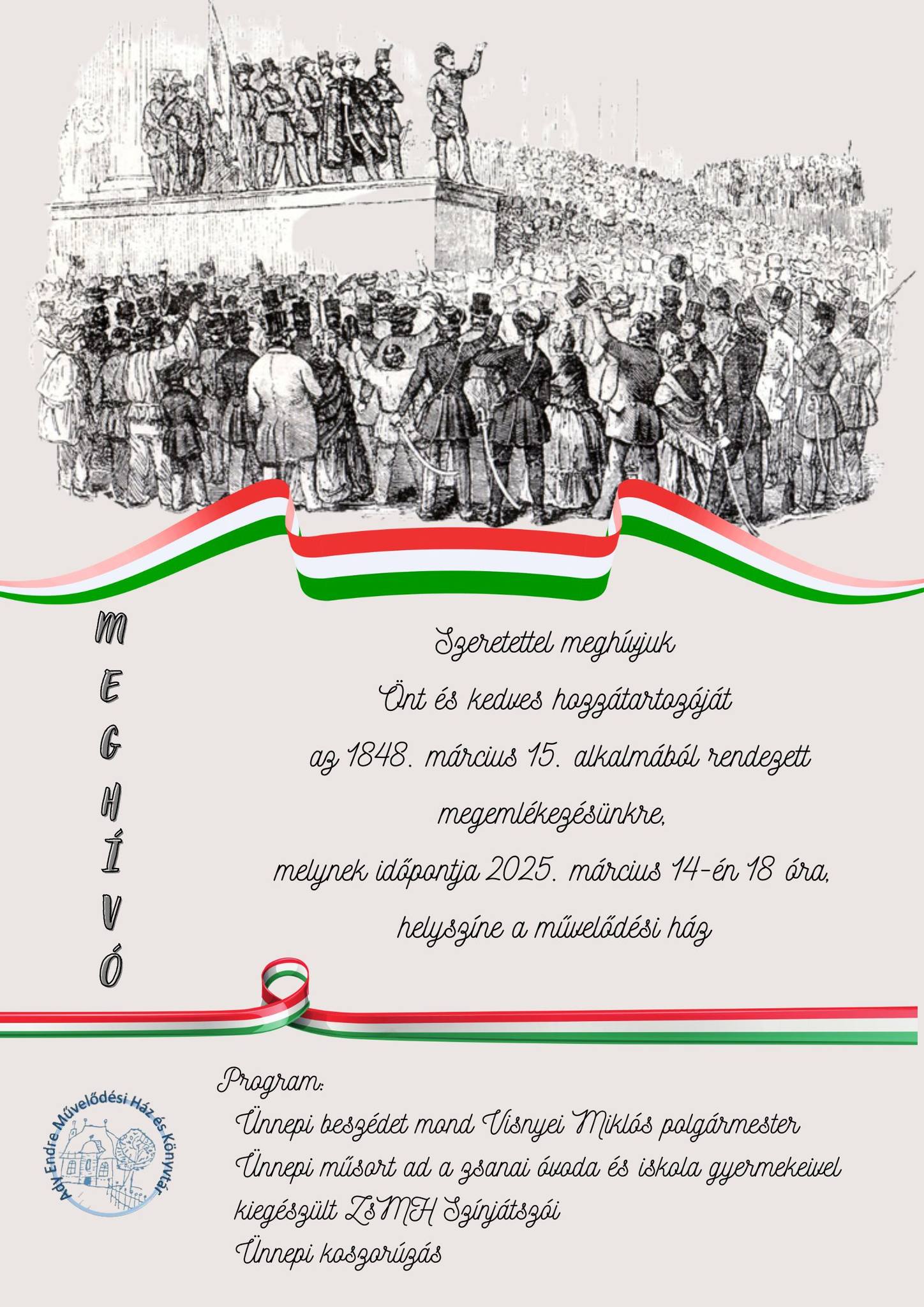 Szeretettel meghívjuk Önt és kedves hozzátartozóját az 1848. március 15. alkalmából rendezett megemlékezésünkre.
