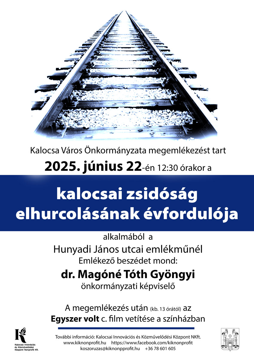 Kalocsa Város Önkormányzata és a Kalocsai Innovációs és Közművelődési Központ NKft. megemlékezést tart A KALOCSAI ZSIDÓSÁG ELHURCOLÁSÁNAK ÉVFORDULÓJA alkalmából. Emlékezzünk együtt!