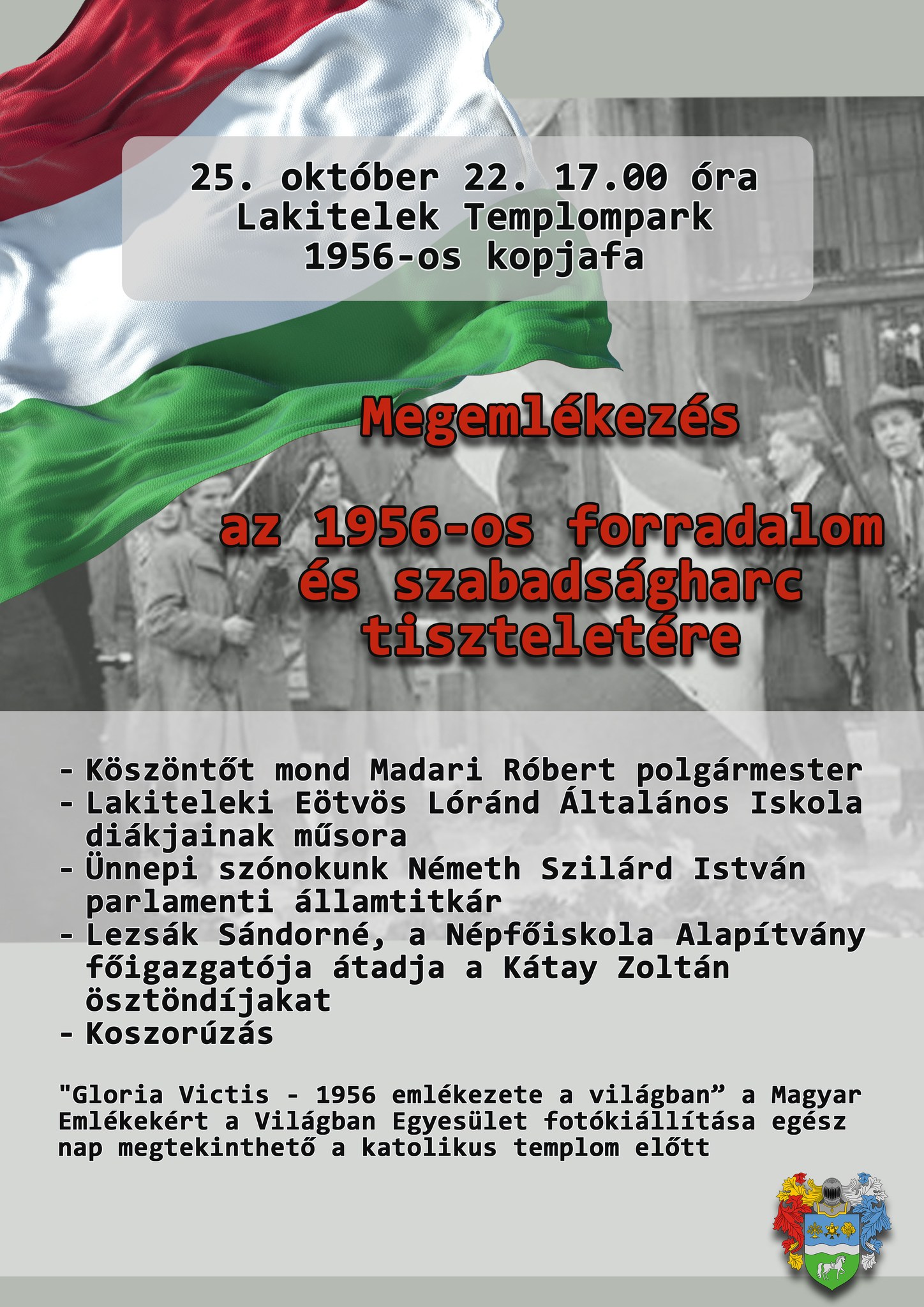 Koszorúzás: "Gloria Victis - 1956 emlékezete a világban” a Magyar Emlékekért a Világban Egyesület fotókiállítása egész nap megtekinthető a katolikus templom előtt.
