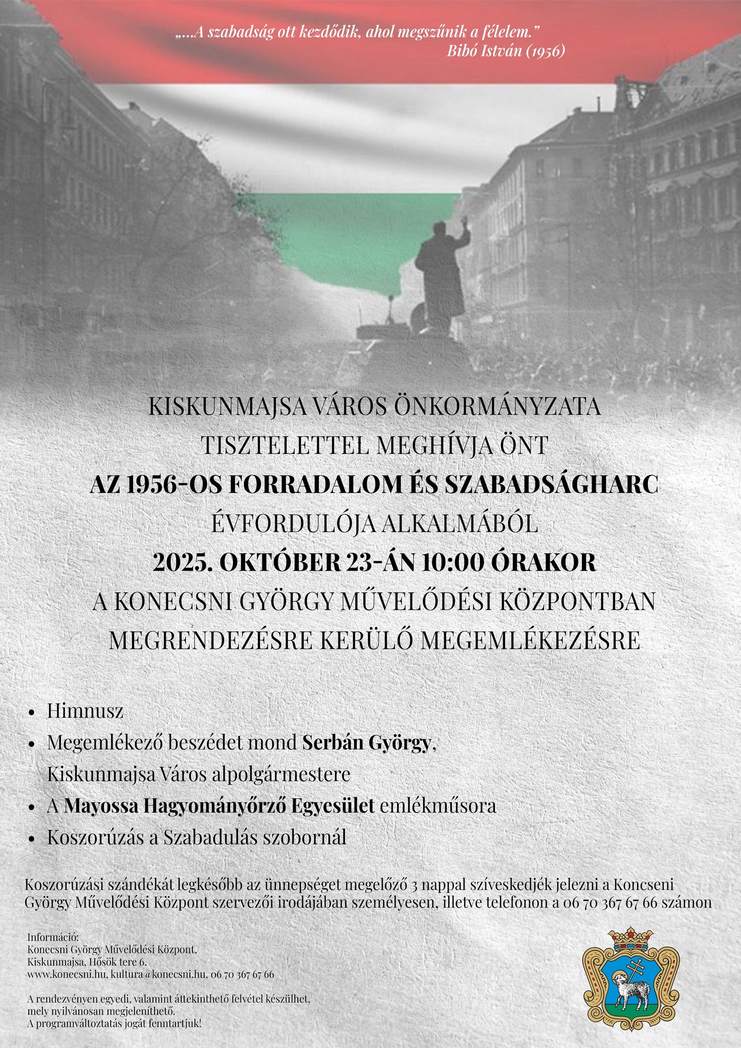 Kiskunmajsa város önkormányzata ünnepei megemlékezést tart az 1956-os forradalom és szabadságharc kitörésének 69. évfordulóján.