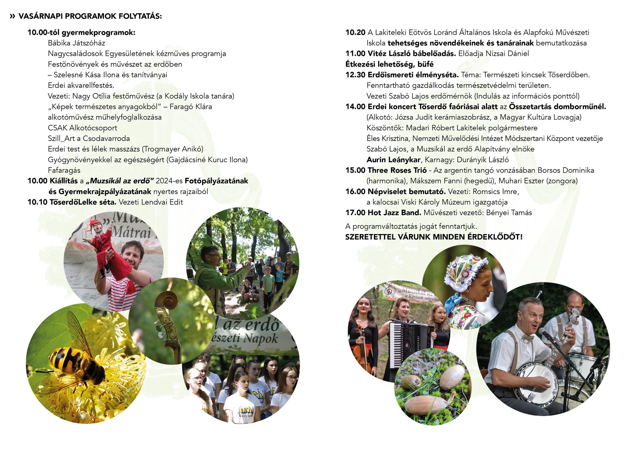 Természet, túra, játék, együttműködés a Tőserdő ismert és kevésbé ismert ösvényein, A Muzsikál az erdő program helyszíneként minőségi muzsikával, gyermekprpgramokkal, vásárral várjuk a közönséget, Hagyományteremtő céllal termelői piacot rendezünk a Tőserdőben, kézműves portékákkal