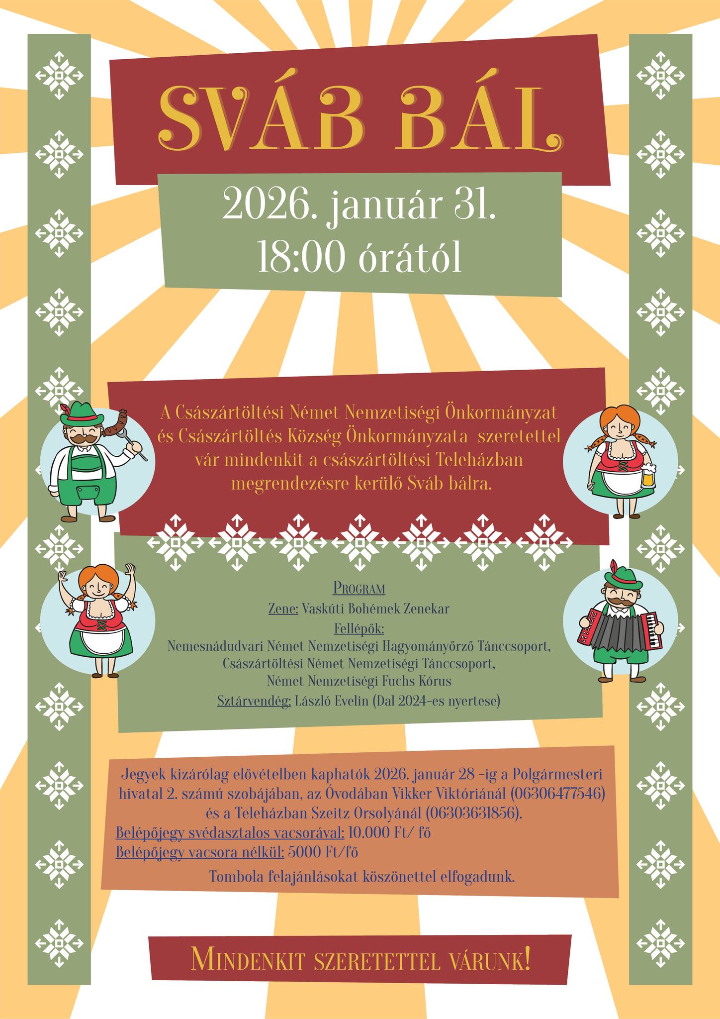 A Császrtöltési Német Nemzetiségi Önkormányzat és Császártöltés Község Önkormányzata szeretettel vár mindenkit a Teleházban rendezett Sváb Bálba.