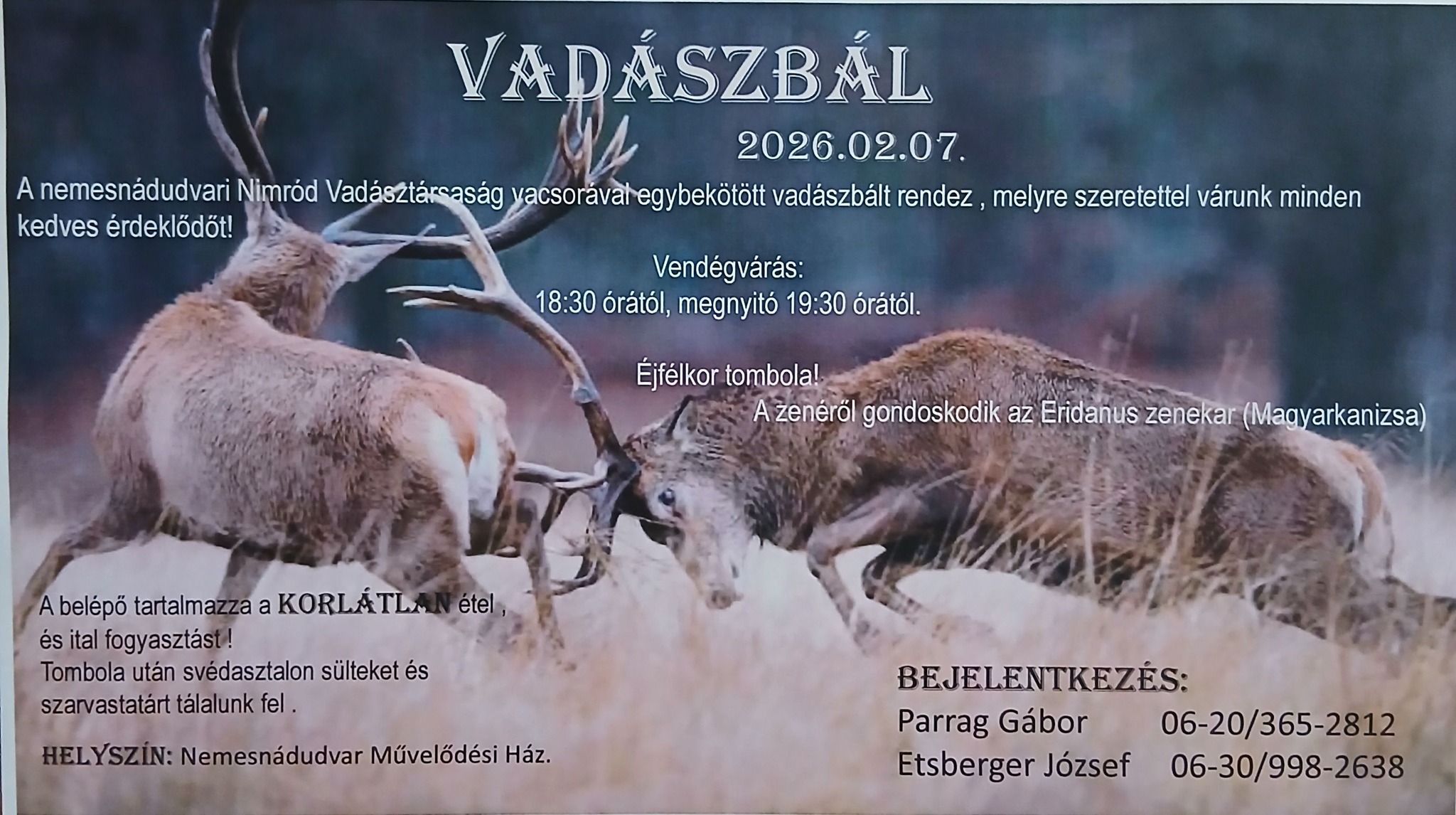 A nemesnádudvari Nimród Vadásztársaság bősèges vacsoràval,èjfèl utàn svèdasztallal, KORLÀTLAN italfogyasztàssal vàrunk minden kedves múlatni vàgyót!