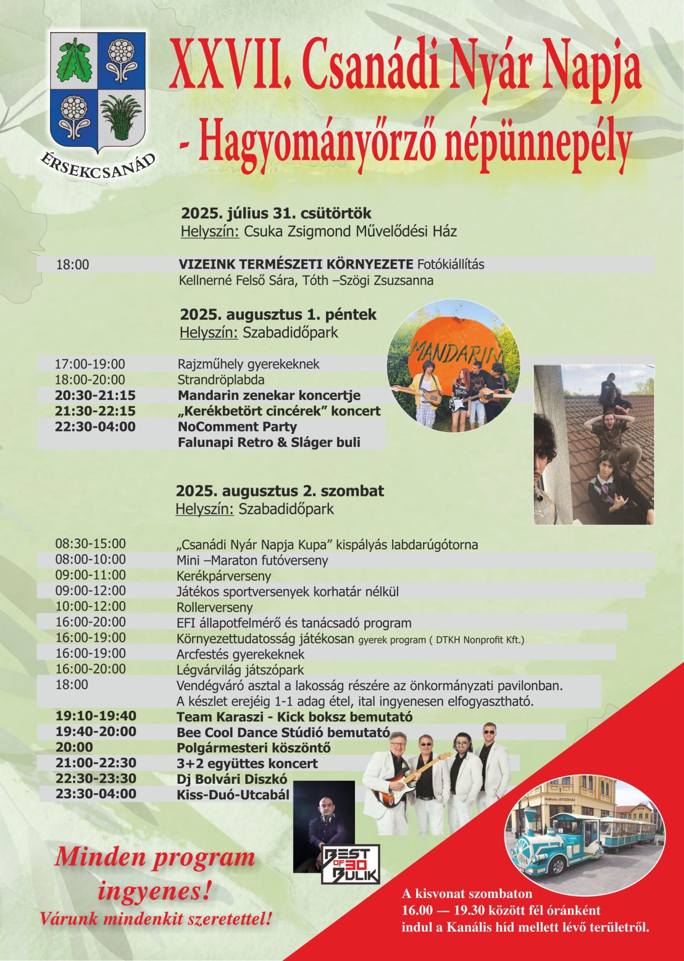 Érsekcsanádi hagyományőrző népünnepély helyi egyesületek bevonásával, sport programokkal, koncertekkel.