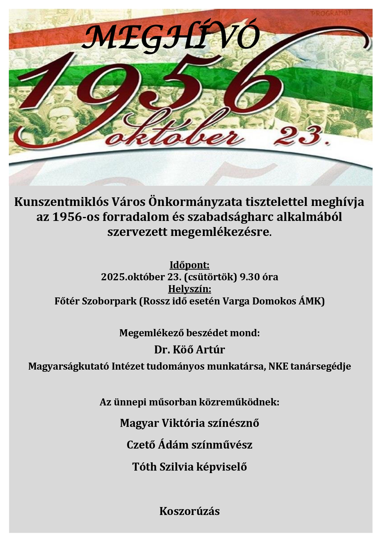 Kunszentmiklós Város Önkormányzata tisztelettel meghívja az 1956-os forradalom és szabadságharc alkalmábó szervezett megemlékezésre.