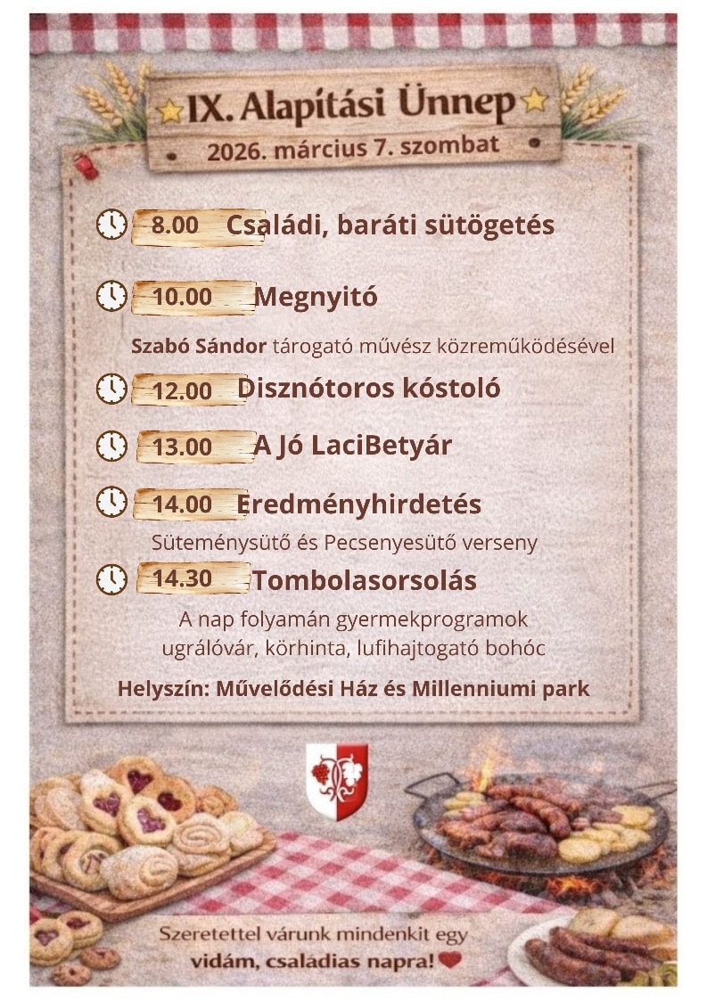 Idén már 9. alkalommal rendezzük meg a település Alapítási ünnepét 2026. március 7-én, szombaton, melyre szeretettel várjuk a kedves lakosságot.