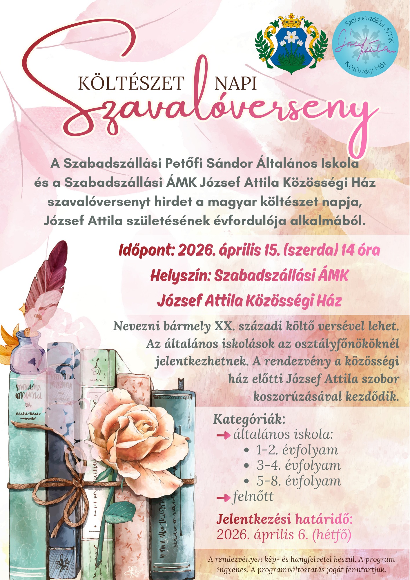 A Szabadszállási Petőfi Sándor Általános Iskola és a Szabadszállási ÁMK József Attila Közösségi Ház szavalóversenyt hirdet a magyar költészet napja alkalmából.