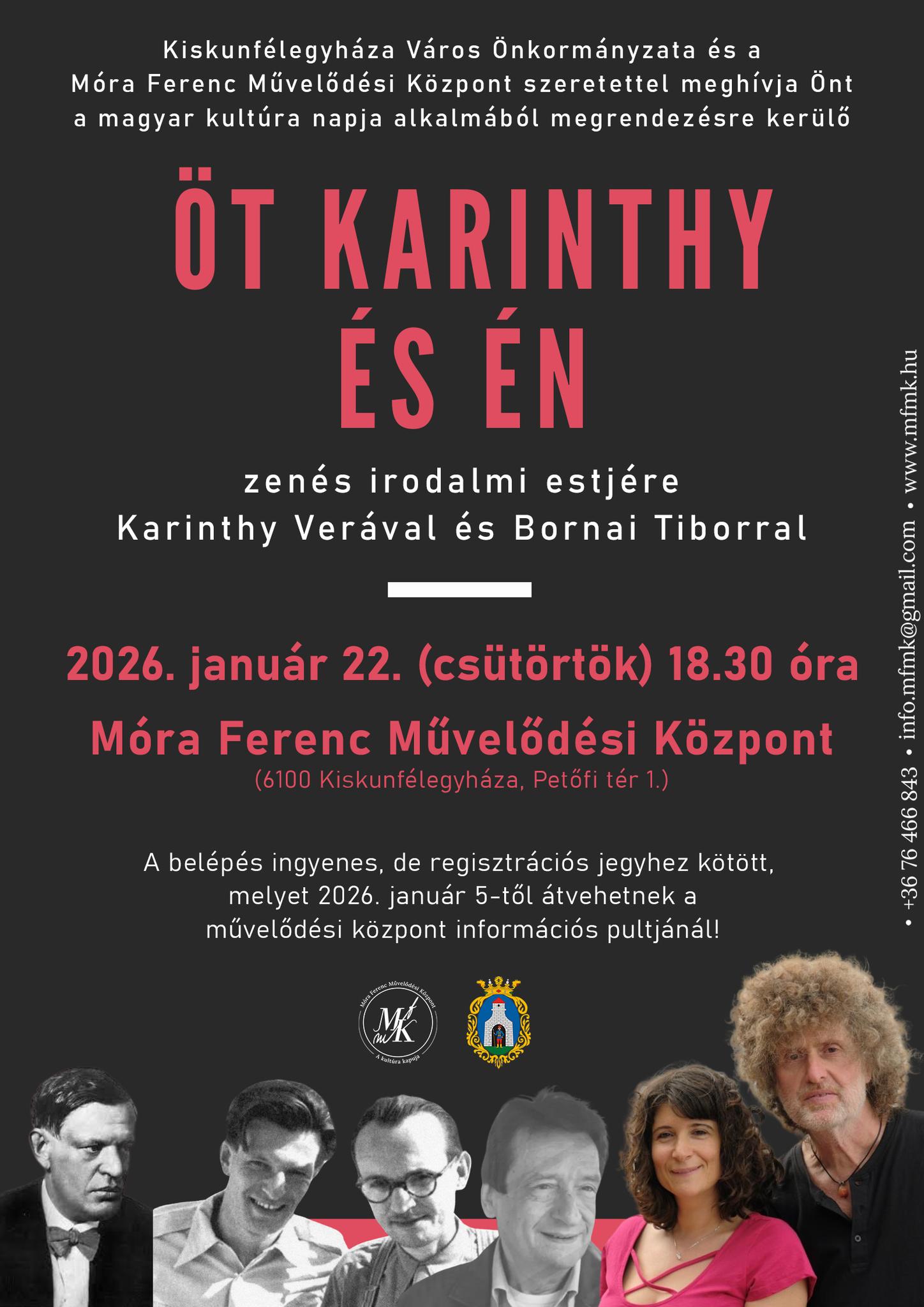 Az „Öt Karinthy és én” című est során Karinthy Vera, a nagy Karinthy Frigyes dédunokája és Bornai Tibor zeneszerző egy vidám este keretében kalandozik a magyar irodalom csodás ligetében. Az est során lesz felolvasás, történetmesélés, ének, zene, és természetesen sok humor.
