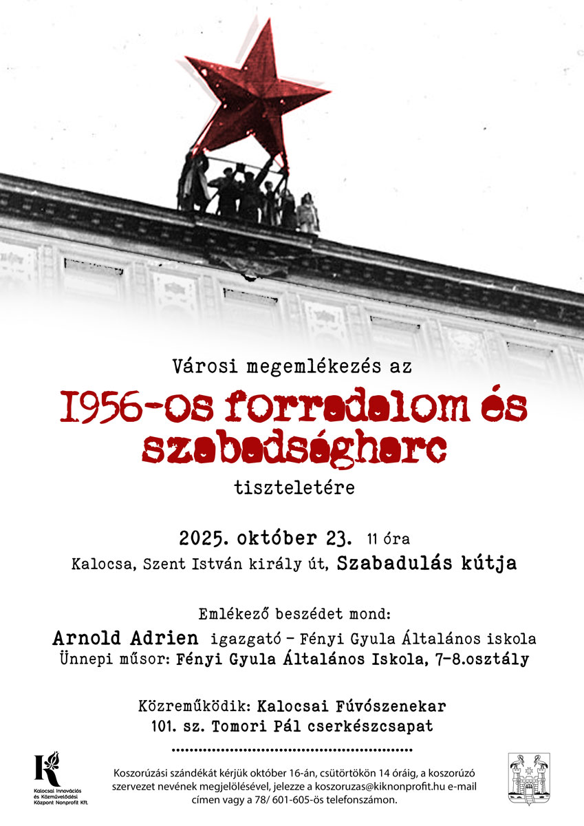 Kunszentmiklós Város Önkormányzata tisztelettel meghívja az 1956-os forradalom és szabadságharc alkalmábó szervezett megemlékezésre.