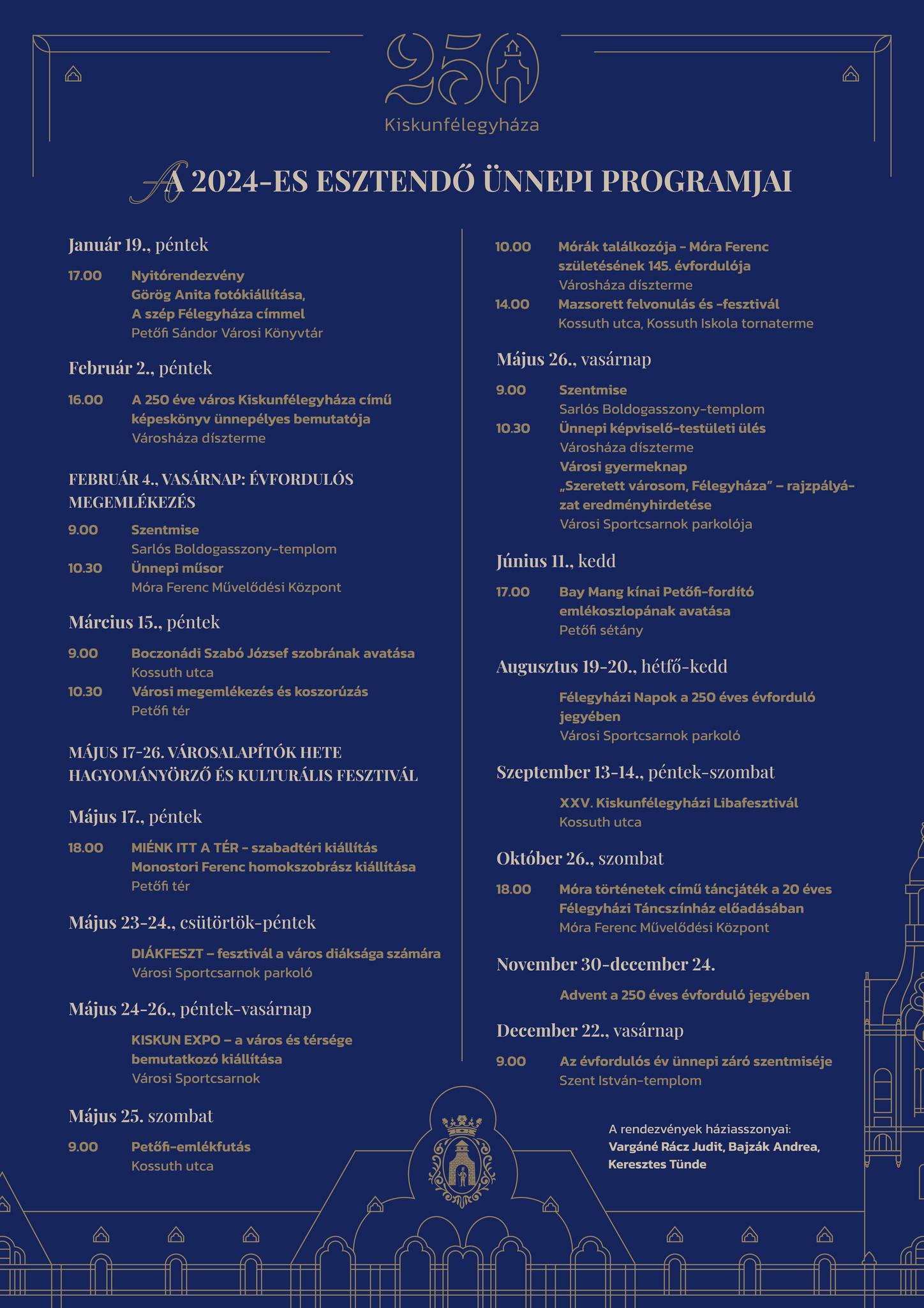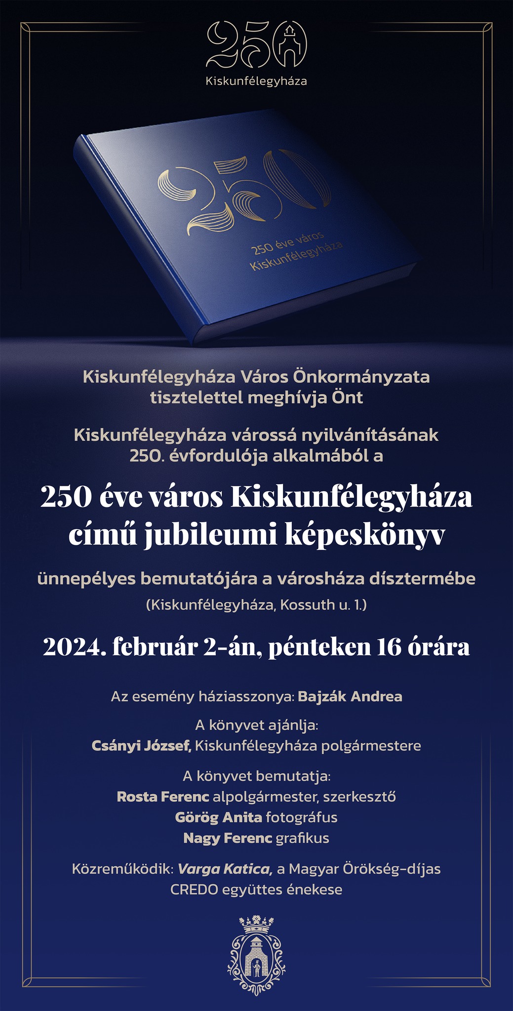 Az évforduló alkalmából elkészült az a jubileumi képeskönyv, amely magyar és angol nyelven mutatja be Kiskunfélegyháza jelenét, épített és természeti örökségét, gazdasági életét, kultúráját, intézményeit. Az ünnepélyes könyvbemutató 2024. február 2-án, pénteken 16 órakor lesz a városháza dísztermében. A könyv február 5-től megvásárolható a Tourinform Irodában és a Kiskun Múzeumban. Szeretettel várnak minden érdeklődőt!