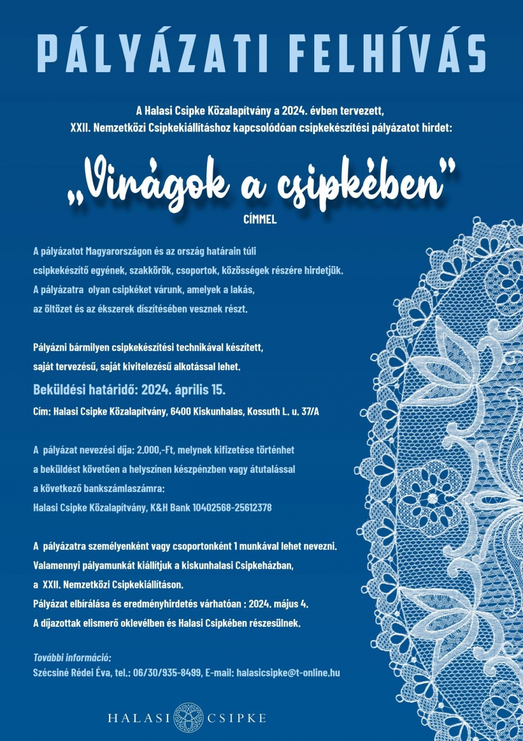 Elő a kreativitással! Várják a csipkés alkotásokat. A Halasi Csipke Közalapítvány a 2024-re tervezett, XXII. Nemzetközi Csipkekiállításhoz kapcsolódóan csipkekészítési pályázatot hirdetett Virágok a csipkében címmel. A pályázaton hazai és az ország határain túli csipkekészítők, szakkörök, csoportok valamint közösségek vehetnek részt.